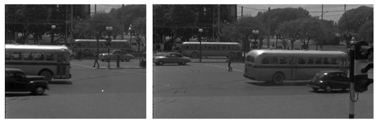 Estamos frente a la entonces Plaza Britania hoy Fuerza Aérea Argentina mientras pasan dos ómnibus de Transportes de Buenos Aires. El más cercano es un Leyland Olympic y el otro podría ser un Mack o un G.M., pero no se ve bien.